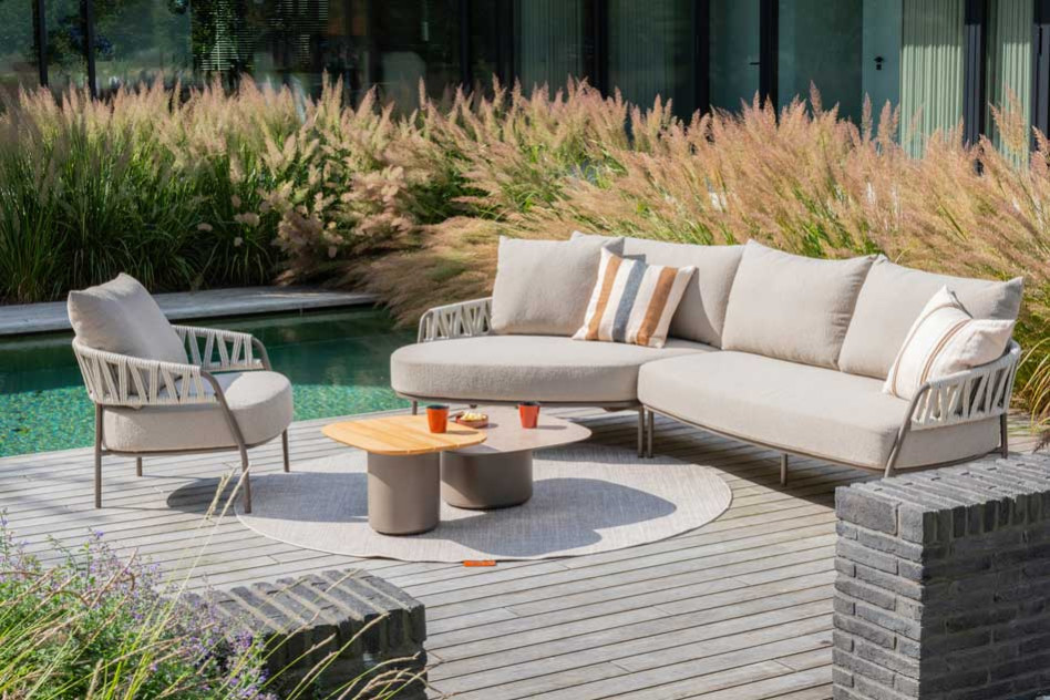 | Korte omschrijving | Deze Calma loungebank met chaise-longue element en Sofie coffeetables is een comfortabele en complete loungeset voor buiten, ideaal voor ontspannen zomerdagen in de tuin of op het terras. Het stevige aluminium frame in terre kleur heeft elegante rondingen en is omhuld met rope in een beige-tint waardoor een elegant kleurcontrast ontstaat. De extra dikke kussens bieden hoog zit- en ligcomfort en maken lange momenten van loungen bijzonder aangenaam. De set wordt aangevuld met Sofie salontafels met afgeronde keramische tafelbladen en een stabiel RVS onderstel in terre kleur, perfect voor drankjes of zomerse hapjes. Dankzij het gebruik van weerbestendige materialen is de loungeset ideaal langdurig buitengebruik. Samen zorgen de loungebank en salontafels voor een sfeervolle, comfortabele buitenplek waar genieten centraal staat. |