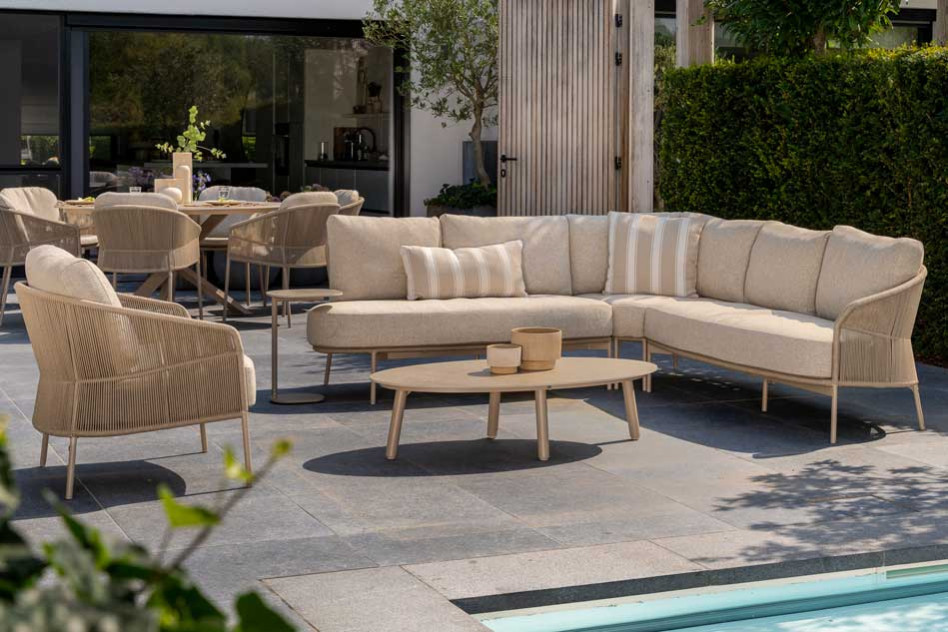 | Korte omschrijving | Deze Florence hoek-loungeset is een ruime en comfortabele loungeset voor buiten, ideaal voor ontspannen zomerdagen in de tuin of op het terras. De set bestaat uit een hoekbank met royale zitruimte, een stevig aluminium frame omhuld met rope in latte kleur, wat zorgt voor een chique uitstraling. De dikke, zachte kussens maken loungen extra plezierig en nodigen uit tot lange momenten van ontspanning in de zon. Dankzij de weerbestendige materialen is de loungeset geschikt voor langdurig buitengebruik. De warme latte-kleur versterkt de zomerse sfeer en maakt van iedere buitenruimte een uitnodigende plek om te genieten van comfort en gezelligheid. |