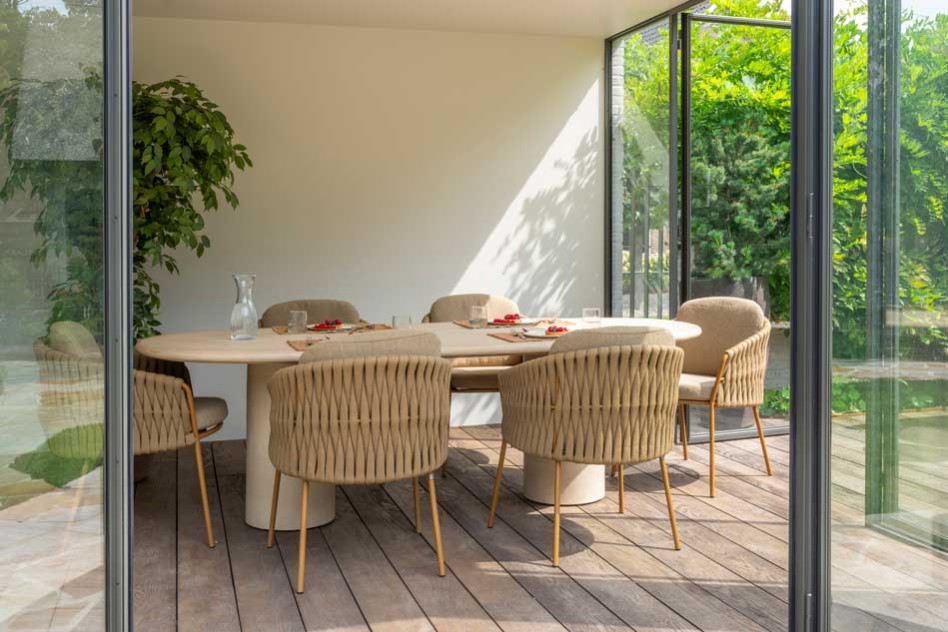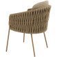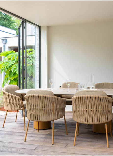 | Korte omschrijving | De Molina Dining Chair is een perfecte keuze voor zonnige diners in je tuin of op het terras. Het stevige frame van gecoat RVS in de warme amberkleur biedt duurzaamheid en stabiliteit, terwijl het gevlochten rope de stoel omhuld en een uitnodigend en comfortabel zitvlak vormt. De rijk gevulde, weerbestendige kussens zorgen voor extra comfort en zijn bestand tegen de weersomstandigheden, ideaal voor langdurig buitengebruik. De zitting van de stoel ondersteunt rug en armen op een natuurlijke manier, zodat je ook tijdens lange diners ontspannen kan zitten. Combineer de Molina dining stoel moeiteloos met één van onze op maat gemaakte tafel voor een dining set die perfect bij jouw tuin past. |