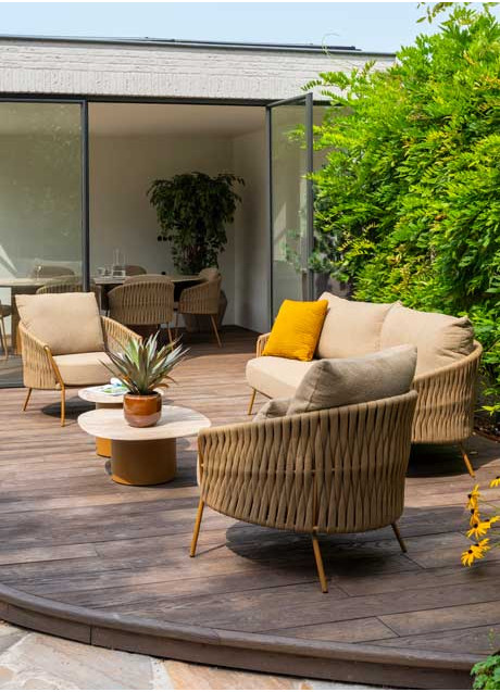 Molina living chair amber with 2 cushions De Molina Living Chair brengt comfort en stijl samen in een uitnodigend ontwerp dat perfect past in elke tuin of op elk terras. Het stevige frame van gecoat RVS in een warme amberkleur vormt de basis waar het dik gevlochten en zachte rope omheen is geweven. De royale, weerbestendige kussens bieden uitzonderlijk zitcomfort en zijn weerbestendig zodat de stoel seizoen na seizoen mooi blijft. Dankzij de comfortabele zitdiepte en subtiele rondingen van de rugleuning is deze loungestoel ideaal om in weg te zakken tijdens lange zomeravonden. Combineer de Molina Living Chair met onze op maat gemaakte salontafels voor een set die perfect bij jou past. Molina 3 seater bench amber with 3 cushions De Molina 3-Seater Bench straalt pure zomerse ontspanning uit. Deze royale loungebank combineert een stevig frame van gecoat RVS, voorzien van een amberkleurige poedercoating, met dik gevlochten rope in warme kleuren. Het ambachtelijke vlechtwerk en de zachte, rijk gevulde kussens zorgen voor een luxueus zitcomfort, ideaal voor zomerse middagen of avonden in de tuin. De weerbestendige materialen zijn bestand tegen de weersomstandigheden, waardoor de bank het hele jaar door mooi blijft. Met ruimte voor drie personen biedt deze loungebank zowel stijl als functionaliteit. Combineer de Molina 3-Seater Bench met een op maat gemaakte salontafel voor een complete, harmonieuze loungeset in jouw buitenruimte. |