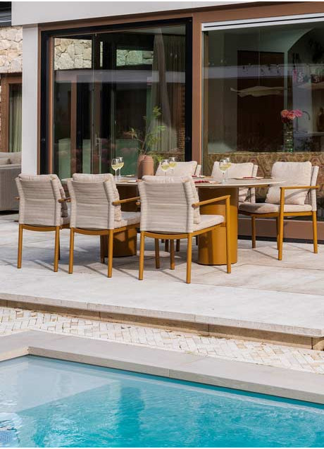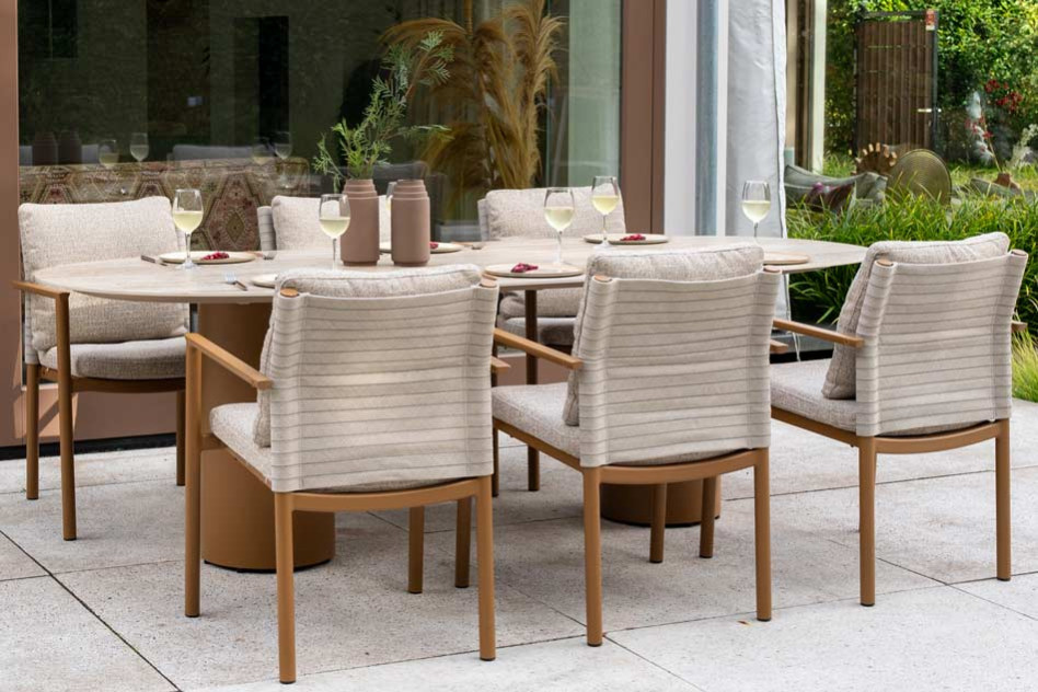 | Deze Safina Dining Chair is een stijlvolle en comfortabele toevoeging aan elke buitenruimte. Het gepoedercoate aluminium frame in warme Amber aardetinten zorgt voor een moderne, natuurlijke uitstraling, terwijl het rope in de rugleuning een uniek detail vormt dat direct opvalt. De stoel is ontworpen voor langdurig zitcomfort en wordt geleverd met twee weerbestendige kussens van hoogwaardig outdoor textiel, bestand tegen de weersomstandigheden. Dankzij de duurzame materialen kan de Safina dining chair het hele jaar door buiten blijven staan. Combineer deze tuinstoelen met een van onze op maat gemaakte tafels en geniet van ontspannen zomerse diners in stijl. | |